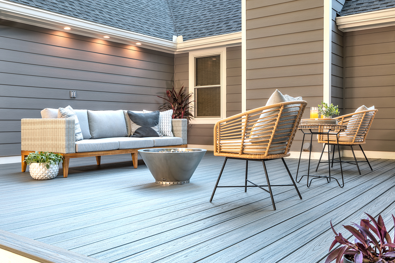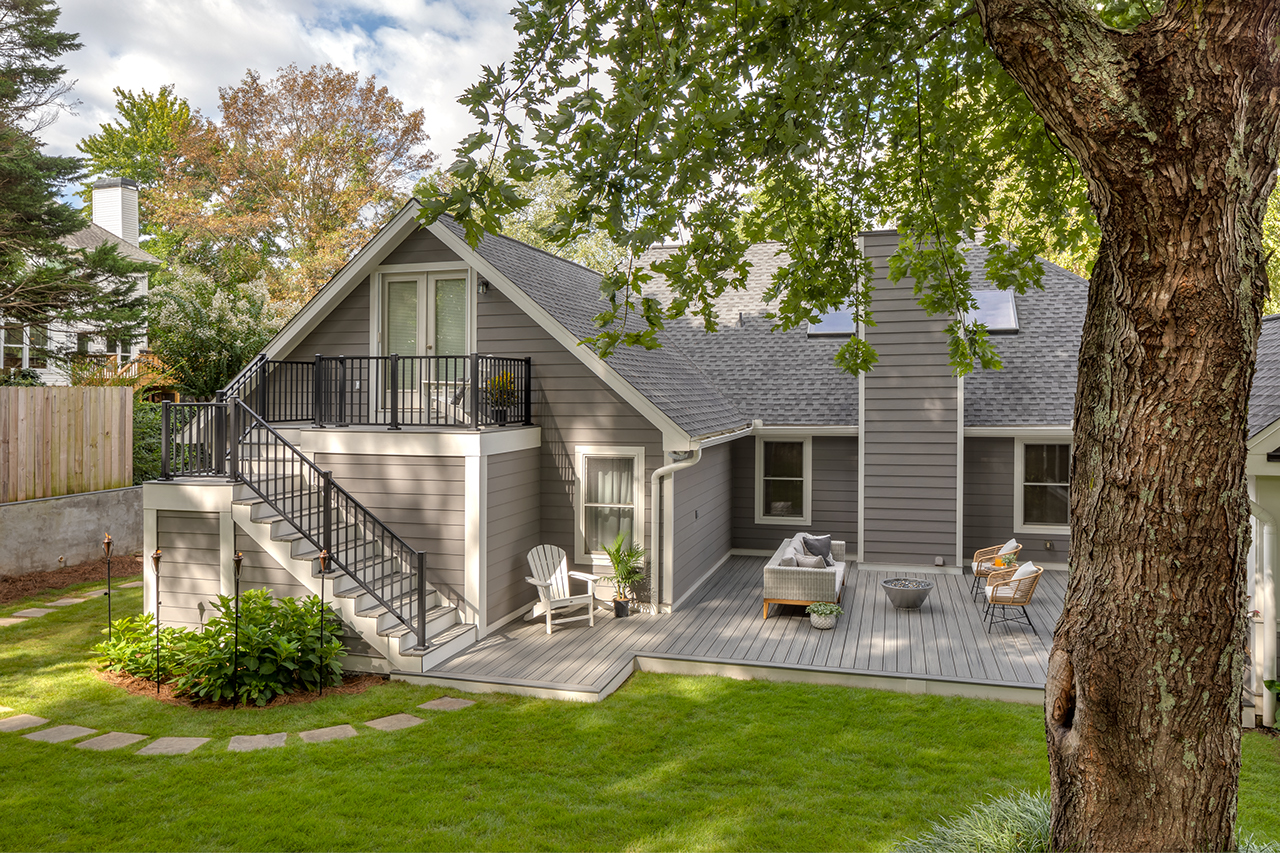 Jų prastėjantis medinis denis buvo atnaujintas su mažai priežiūros reikalaujančiu, kompozitiniu deniu iš Trex Transcend® linijos, spalva Island Mist. Aš mačiau „Trex“ svetainėje Decks.com ir žinau, kad tai yra labiausiai žinomas prekės ženklas, turintis geriausią reputaciją. Tuo metu mano gyvenime tai buvo svarbiausias veiksnys“, – sakė Ericas. Jų turėklai taip pat buvo atnaujinti iš medinių į aliuminio „Signature®“ turėklus. Mes jį mylime. Jis puikiai dera su namo dažais ir juodu stogu. Tai yra tobulas derinys.“
