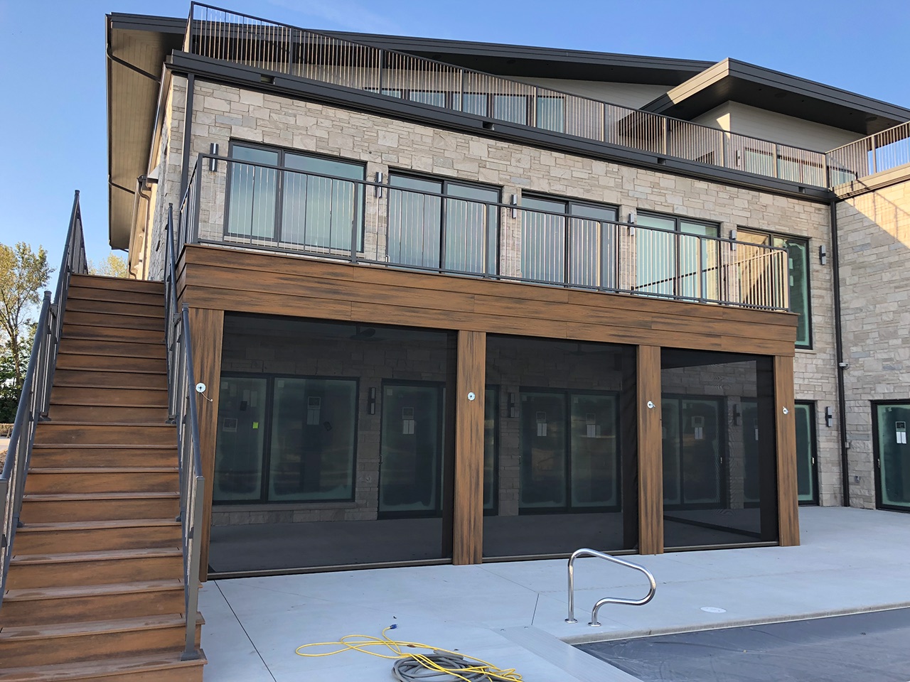 Naudodamas „Trex RainEscape“, Mitchell sugebėjo pristatyti visiškai užbaigtą ir hidroizoliuotą žemesnio lygio gyvenamąją erdvę, skirtą al freskos pramogoms. Trys į garažą panašios angos, pastatytos denio pagrinde, yra įrengtos su įtraukiamais fantomo ekranais, kuriuos galima atidaryti lauko prieigai arba uždaryti, kad būtų sukurtas patogus, daugiasezonis kambarys. Didžiausiame iš atidarymų yra dvigubas takelis, kuriame yra kino projekcijos ekranas, kuris akimirksniu paverčia erdvę prabangiu lauko namų teatru.